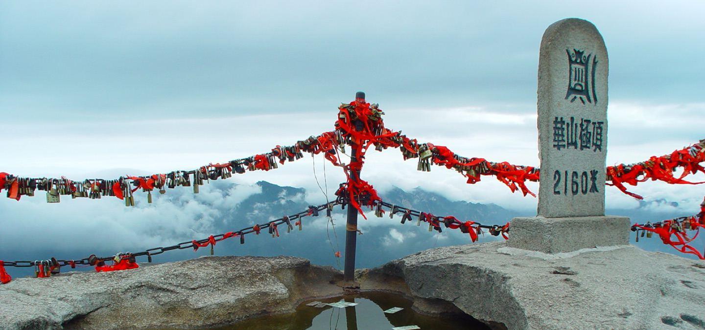 南峰是太华极顶,华山最高处海拔2154.9米,又名落雁峰,站在这里登高望远,便有一种“西岳崚嶒竦处尊,诸峰罗立似儿孙”的感觉。站在最高处的海拔碑前拍张照片便有一种自豪感和征服自然的感觉。我们看到的池子叫仰天池,池中的水久旱不干,久涝不溢,形成一大奇观。南峰由三座小峰组成,站在这里,东望松桧峰,其上松林林立,南望三公山、三凤山,西望孝子峰,松桧峰、落雁峰、孝子峰,三峰相连,象一个老人盘腿而坐的样子。
